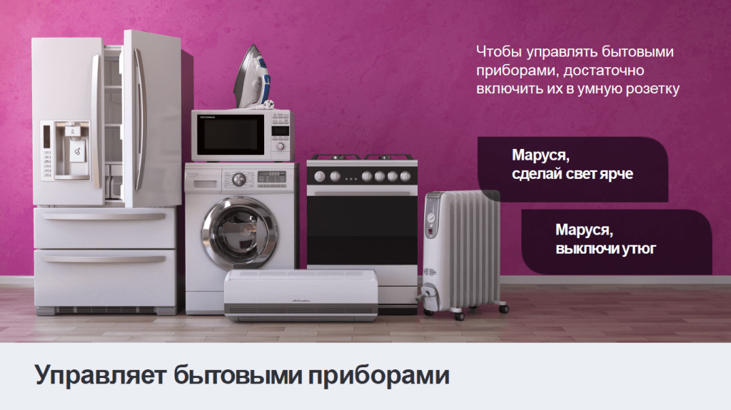 - Включает/выключает умные розетки, лампочки - Управляет бытовой техникой |
