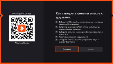 Если контент доступен пользователю и им возможно поделиться с друзьями, рядом с кнопкой «Смотреть» будет кликабельная кнопка «человечков». По нажатию кнопки, отображается подробная инструкция с QR-кодом (Wink.rt.ru/friends). Если у пользователя не активирован Мультискрин, будет кнопка «Добавить», которая ведет на экран привязки номера телефона.