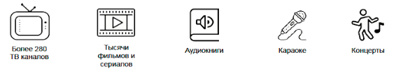 Это сотни ТВ каналов, тысячи любимых фильмов и сериалов, мультфильмы и развивающие передачи для малышей, а также множество других развлечений: Аудиокниги, Караоке, Концерты, Спорт&Фитнес, Блогеры