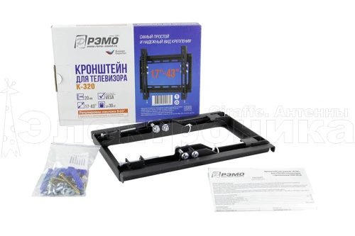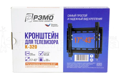 Настенный телевизионный кронштейн подойдет для телевизоров с диагональю до 43 дюймов при весе до 30 кг и имеет возможность крепления телевизора под наклоном 10 градусов в вертикальной плоскости.