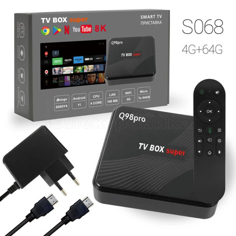 Характеристики: Q98pro TV BOX • Тип: Android приставка для цифрового ТВ • Модель: Q98pro TV BOX • Цифровые телевизионные стандарты: Android 11 • Поддержка: WIFI 5G • Формат сжатия видео: H.264 AVC • Стандарты HDTV: 8K ULTRA HD • Встроенная оперативная помять: 4/64GB • Цифровые разъёмы: HDMI,RCA, 2xUSB, ETH. CARD • Питание: 5V-2A • Комплектация: кабель питания, пуль дистанционного управления с голосовым управлением , HDMI кабель • Размер упаковки: 192*125*55мм • Вес: 334г