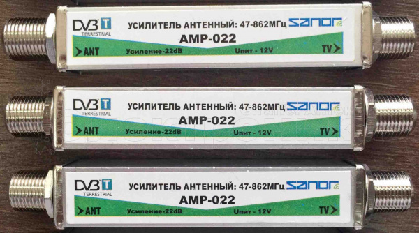 Усилитель AМР- 22 Серия усилителей , устанавливающихся в разрез кабеля , питание 12 Вт Усилитель антенный, 47-862 МГц, усиление 22дБ, питание 12В